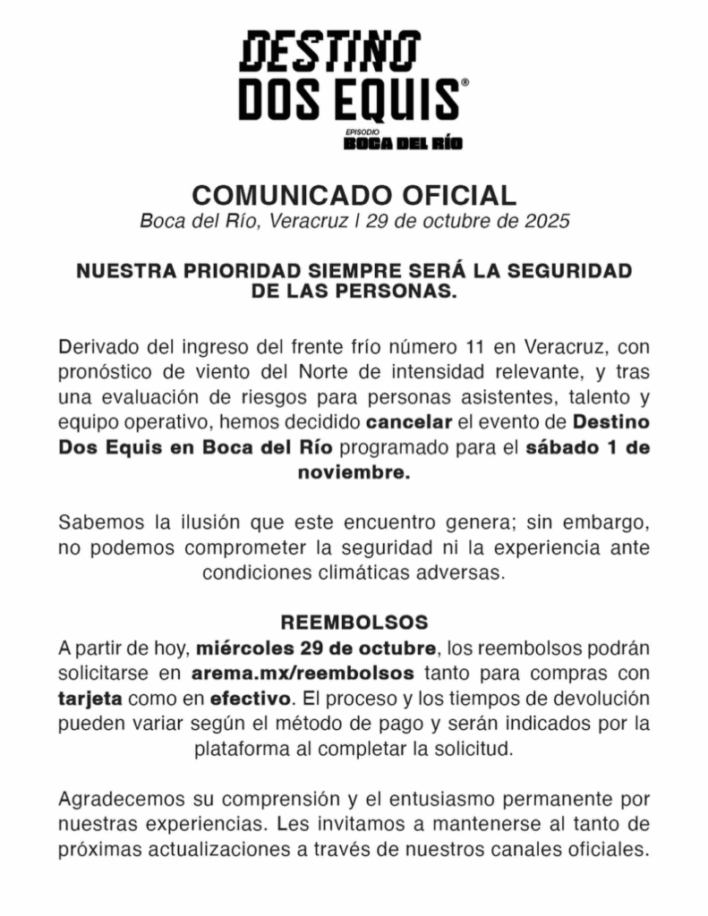 El festival Destino Dos Equis, producido por Apodaca Group, fue cancelado en Veracruz debido a las condiciones climatológicas adversas que impedirían garantizar la seguridad de los asistentes. La decisión se comunicó oficialmente el martes 29 de octubre a través de los canales oficiales del evento y de la productora.