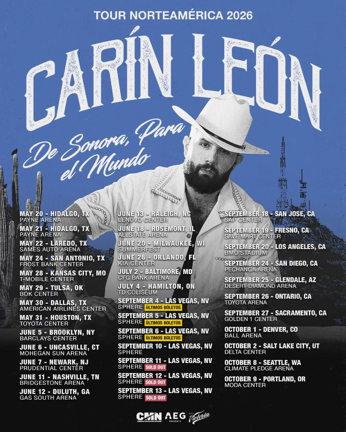 “Volver a Estados Unidos y Canadá para reencontrarme con mi gente me tiene muy emocionado”, declaró Carin León a Billboard. “Regreso con nuevas canciones, pero también con toda la historia, las emociones y el camino que hemos construido juntos”. La gira no solo promete un repertorio actualizado, sino también una producción escénica diseñada para crear una experiencia íntima y poderosa. Un hito sin precedentes será su residencia en el Sphere de Las Vegas, donde el artista sonorense hará historia en septiembre como el primer intérprete latino en actuar en el revolucionario recinto, con siete funciones programadas debido a la abrumadora demanda.
