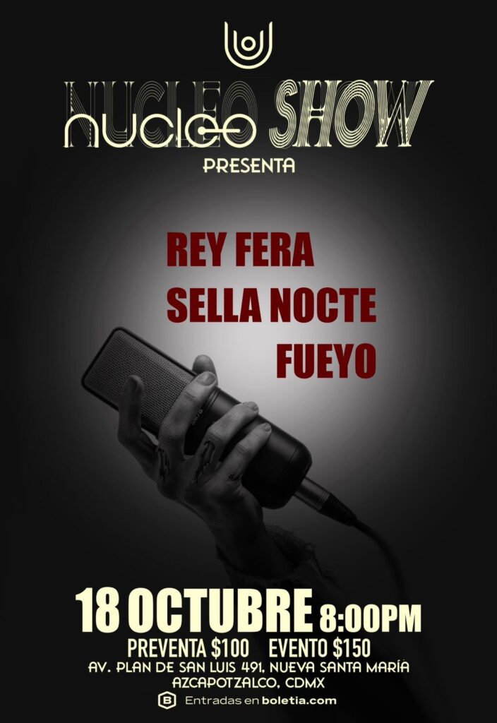 Núcleo Emergente presentará en vivo a Rey Fera, Sella Nocte y Fueyo el sábado 18 de octubre, de 8:00 p.m. a 11:30 p.m., en Avenida Plan de San Luis 491, colonia Nueva Santa María, Ciudad de México. Los boletos están disponibles en preventa a un costo de $100 MXN más cargos, con la opción de pago a meses fijos con tarjetas de crédito participantes.